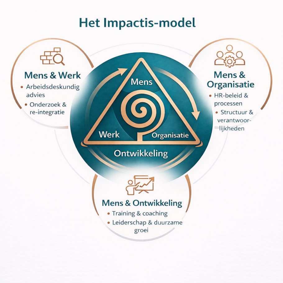 Het Impactis-model laat zien dat duurzame oplossingen ontstaan wanneer mens, werk en organisatie goed op elkaar aansluiten: